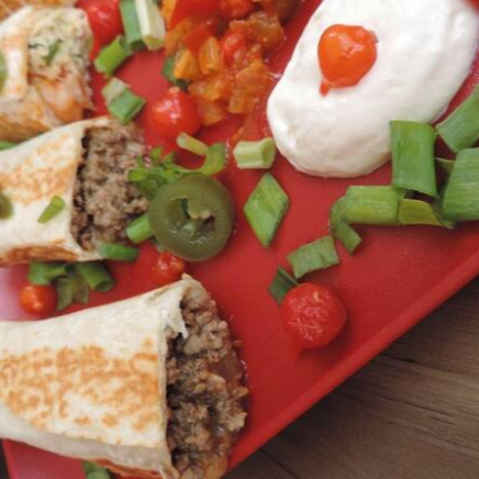 Tortilla de trigo fininha e levemente tostada, enrolada e recheada com delícias típicas Mexicanas. Montado com carne moída, queijo prato, salsa Mexicana, guacamole e sour cream.
