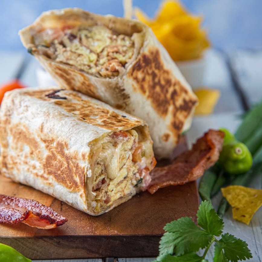 Apresentamos 'The Best Breakfast Burrito in the World', um burrito irresistível e repleto de sabor. Este maravilhoso prato é composto por uma suculenta camada de ovos mexidos, harmoniosamente combinada com bacon crocante e queijo derretido. Acrescentamos também nossa salsa fresca, que proporciona um toque picante e refrescante, e fatias de abacate, que trazem cremosidade e equilíbrio ao prato. Adi