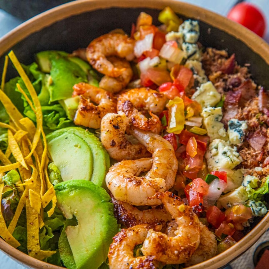 Saboreie a nossa 'Salada Cobb', uma delícia da categoria 'Saladas, Wraps & Bowls'. Este prato é composto por frescas folhas verdes, ricamente cobertas com queijo gorgonzola de sabor marcante, fatias suculentas de avocado, crocantes pedaços de bacon e uma salsa fresca vibrante, tudo adornado com tiras crocantes de tortilha. Personalize o seu prato com a adição de uma proteína à sua escolha: pode se
