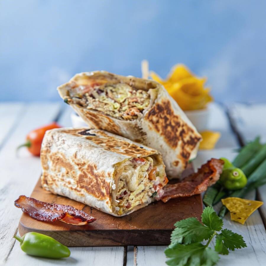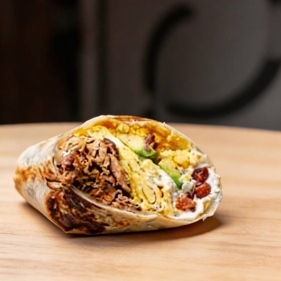 Apresentamos 'The Best Breakfast Burrito in the World', um burrito irresistível e repleto de sabor. Este maravilhoso prato é composto por uma suculenta camada de ovos mexidos, harmoniosamente combinada com bacon crocante e queijo derretido. Acrescentamos também nossa salsa fresca, que proporciona um toque picante e refrescante, e fatias de abacate, que trazem cremosidade e equilíbrio ao prato. Adi
