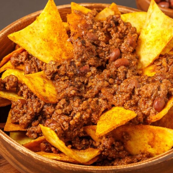 Porção de nachos com chilli e cheddar.