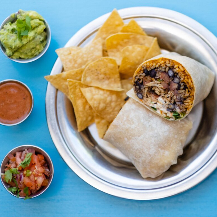 1 burrito frango, 1 burrito chilli, nachos e guacamole.