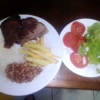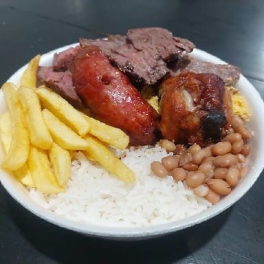 150g de suculenta Alcatra, um pedaço de frango e outro de linguiça. Acompanha arroz, feijão, fritas e farofa. Serve muito bem a 1 pessoa.