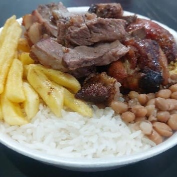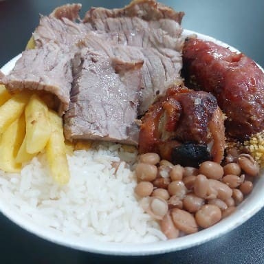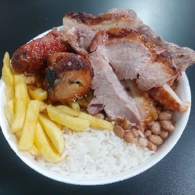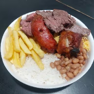 150gr de uma deliciosa Costela bovina, um pedaço de frango e outro de linguiça. Acompanha arroz, feijão, fritas e farofa. Serve muito bem a uma pessoa.