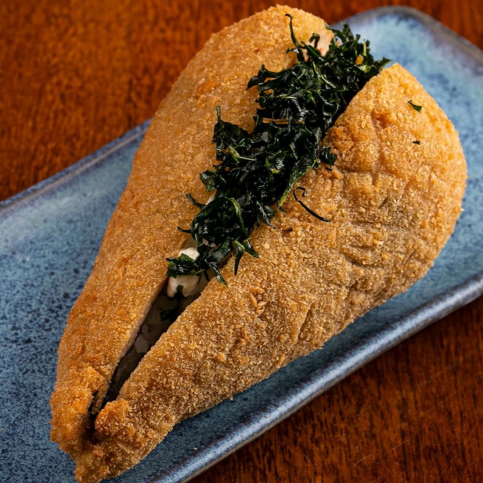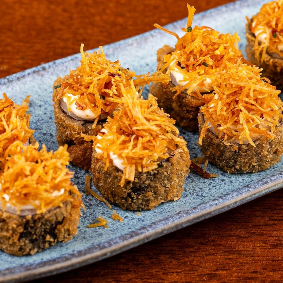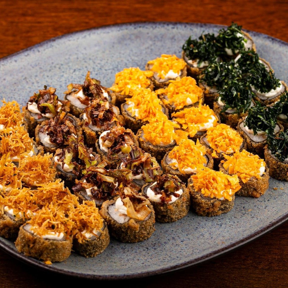Salmão grelhado, Cream Cheese, nori, farinha panko, arroz, couve crispy Mandamos hashi, shoyu, tarê