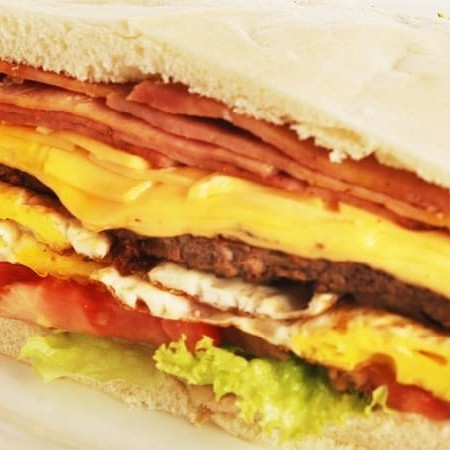 Hambúrguer 90grs, Queijo Prato derretido, Ovo frito, Presunto, Bacon, Alface, Tomate e Maionese.