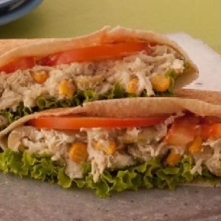 Pão fresquinho recheado com frango desfiado temperado no ponto certo, acompanhado requeijão light, milho, alface e tomate fresquinhos.