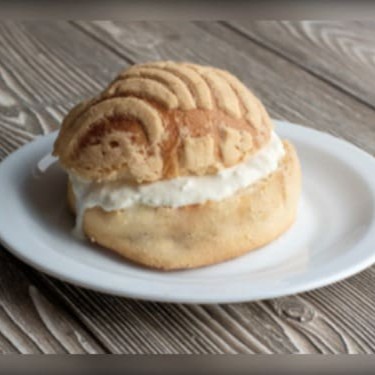 Um delicioso pão coberto com creme e coco.