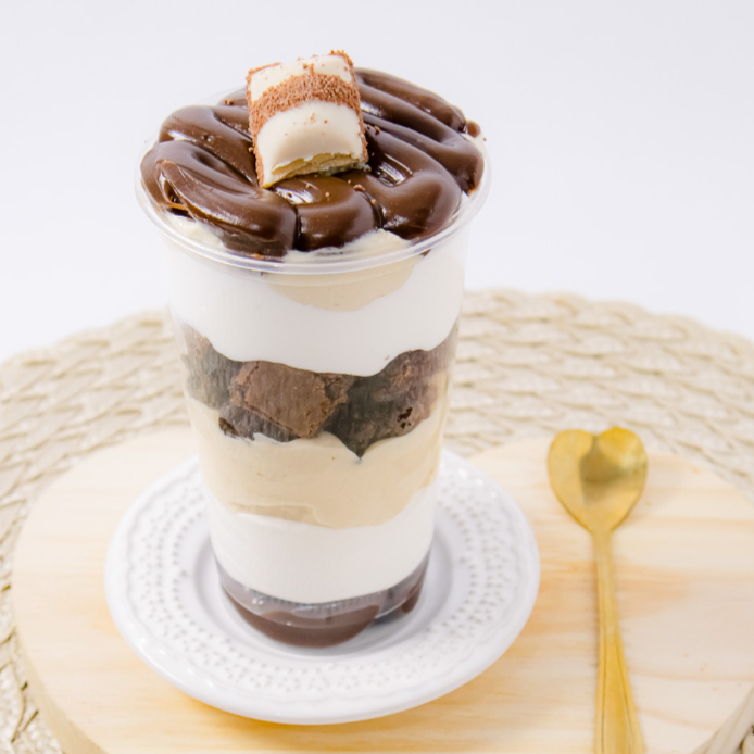 Nosso copo é composto com camadas de nutella, chantininho, pedaços de brownie e brigadeiro de ninho, finalizado com brigadeiro ao leite e nutella