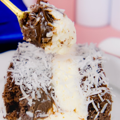 Massa de chocolate bem molhadinha e recheio de brigadeiro e coco bem cremosinho
