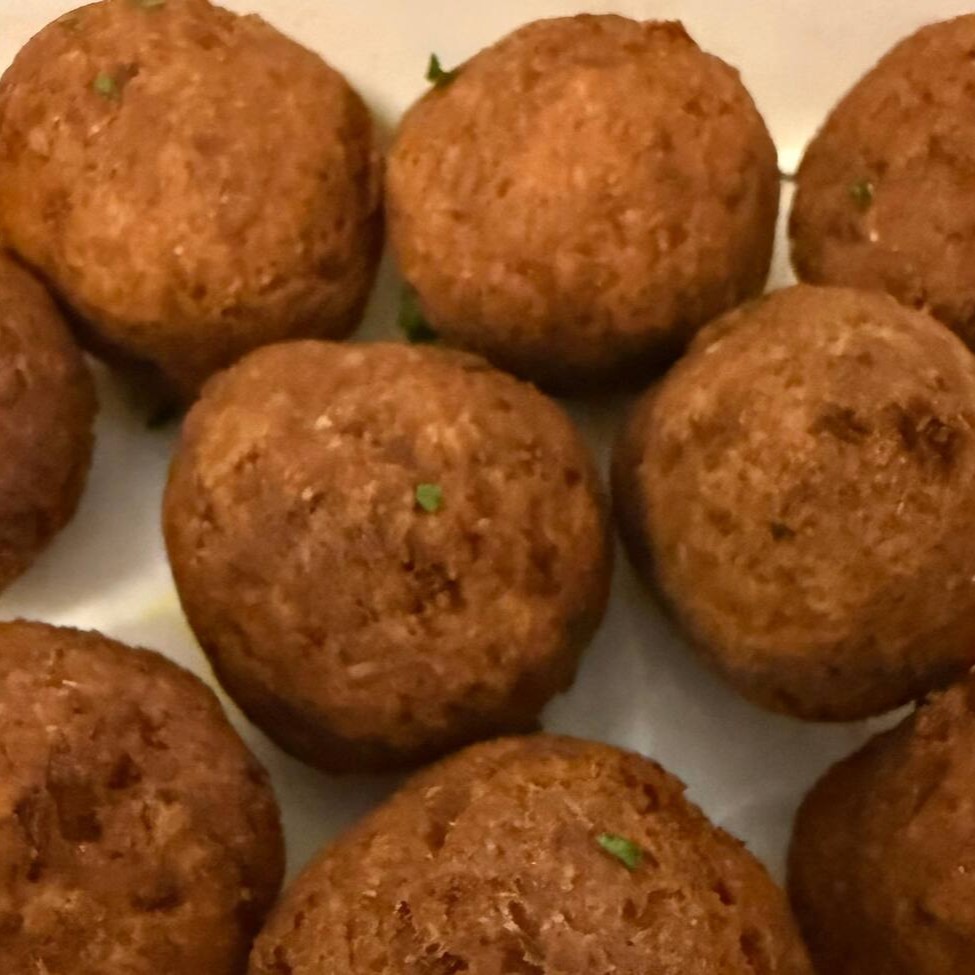 Mini falafels crocantes por fora e macias por dentro, feitas com grão-de-bico , ervas frescas e especiarias libaneses. Servidas com molho de tahine à parte.
