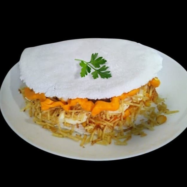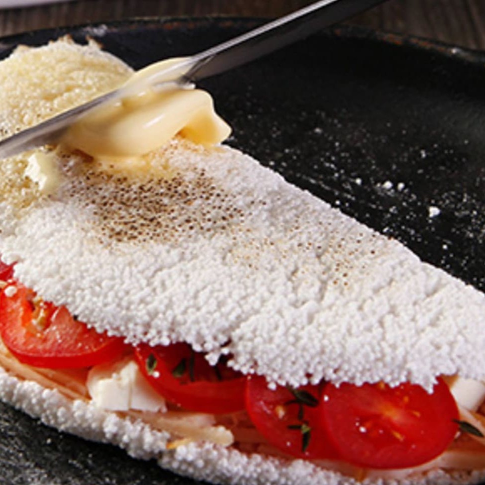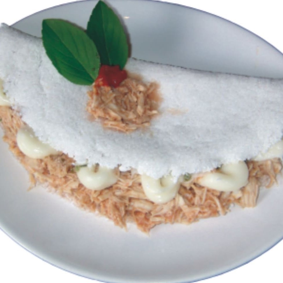 Tapioca c/ manteiga, nosso frango especial da casa, bacon, mussarela, calabresa, orégano, milho e Catupiry ou cheddar.
