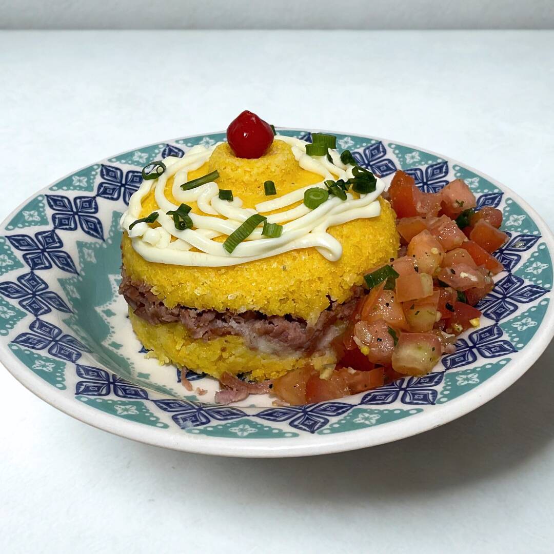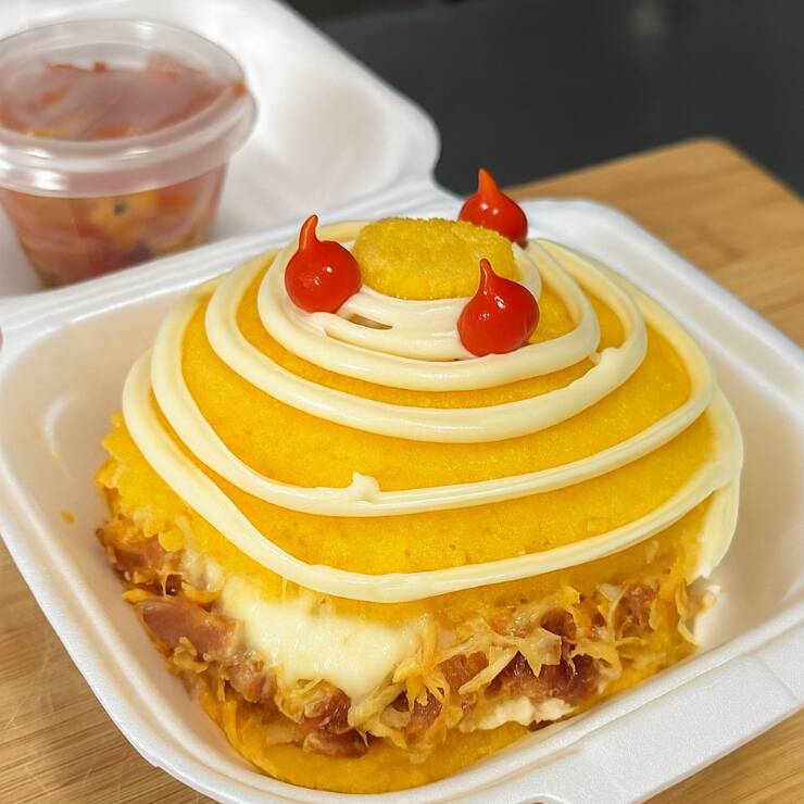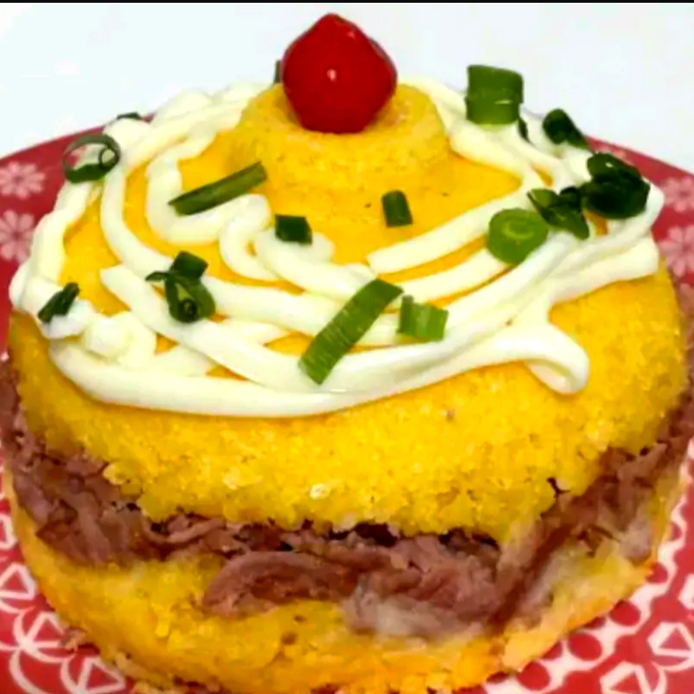 Cuscuz recheado com frango desfiado, bacon, mussarela e requeijão, em cima vai mais um adicional de requeijão e para ficar ainda melhor acompanha um delicioso vinagrete.