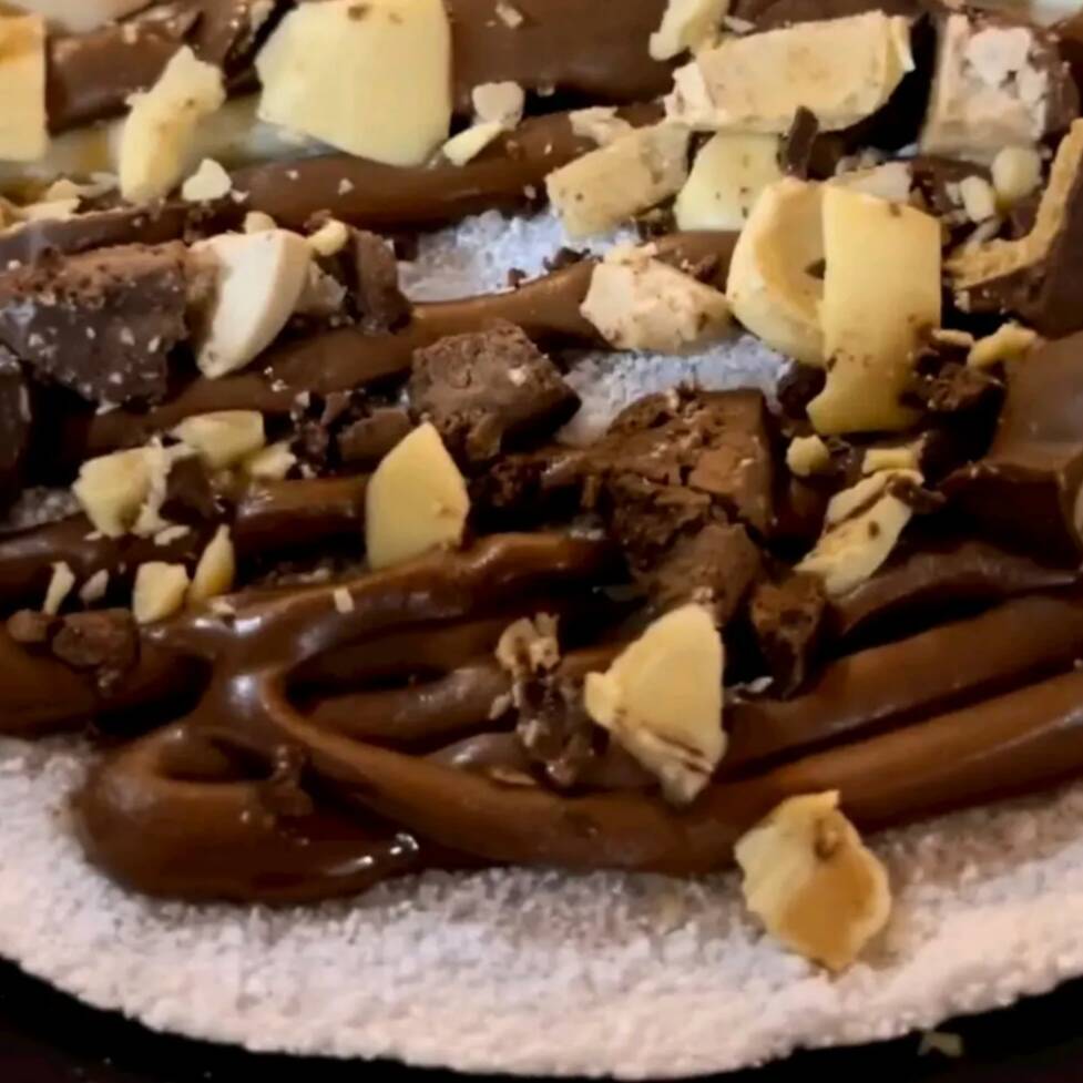 Massa de tapioca artesanal, recheado com chocolate ao leite e paçoca.
