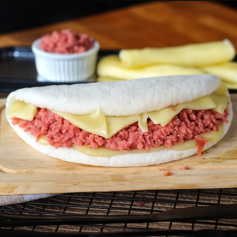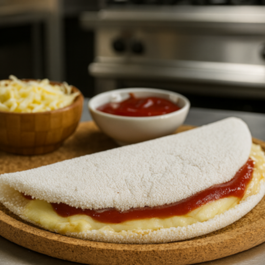Massa de tapioca artesanal, calabresa ralada (aurora), mussarela e requeijão premium.