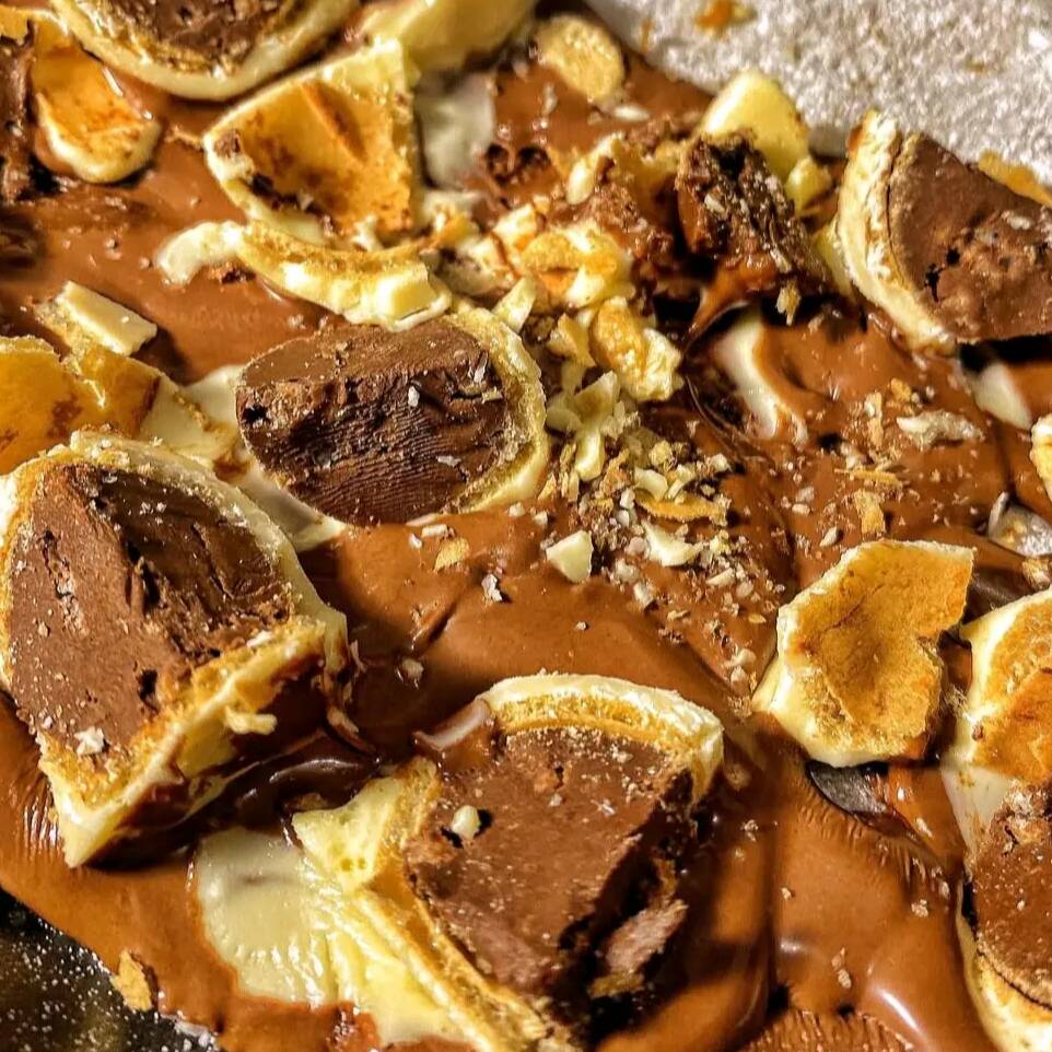 Massa de tapioca artesanal, recheado com chocolate ao leite e ouro branco.