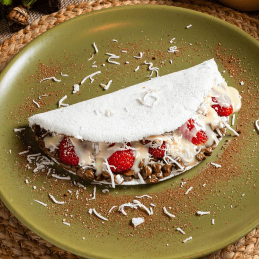 Massa de tapioca artesanal, recheado com morango fresco picado, coco e leite condensado.