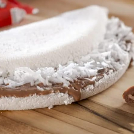 Massa de tapioca artesanal, recheado com chocolate ao leite, coco fresco e leite condensado.