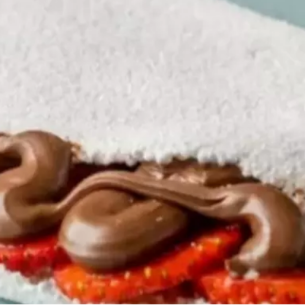 Massa de tapioca artesanal, recheado com morango fresco picado e chocolate ao leite .