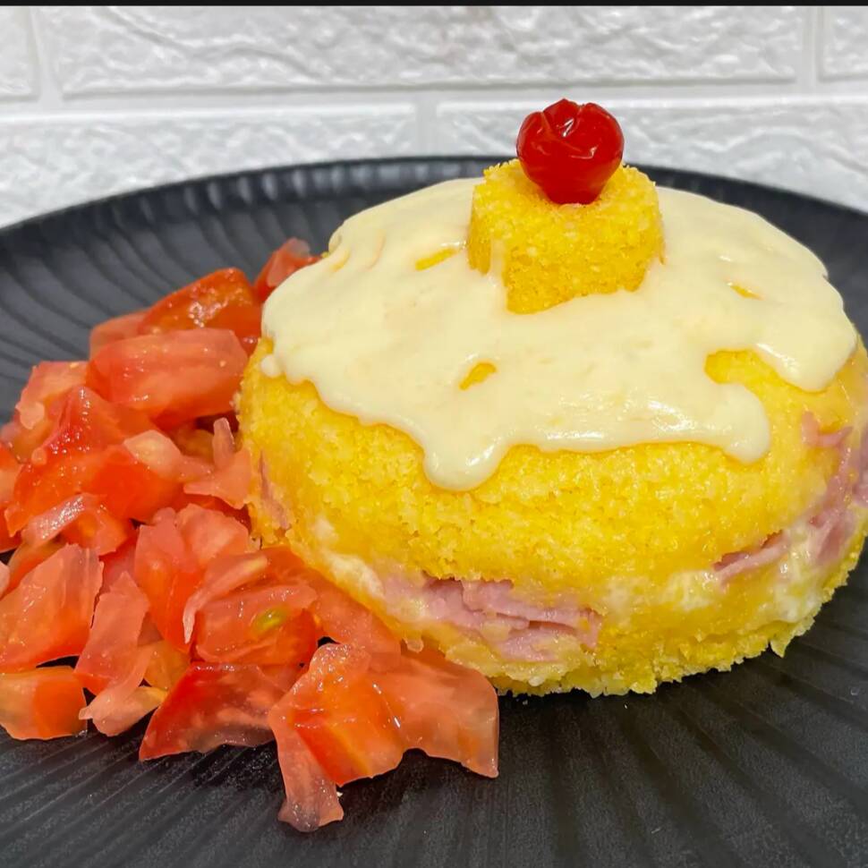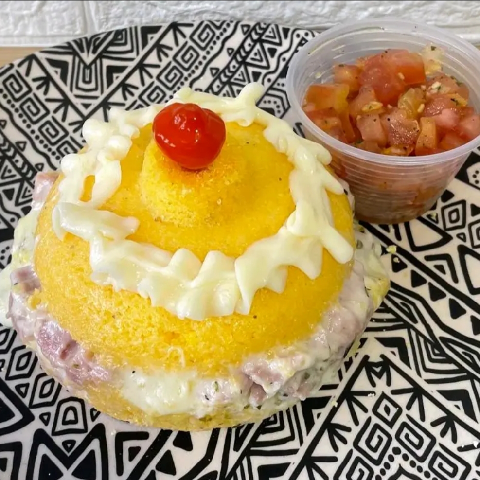 Cuscuz recheado com presunto, mussarela, requeijão e orégano em cima vai mais um adicional de requeijão e para ficar ainda melhor acompanha um delicioso vinagrete.