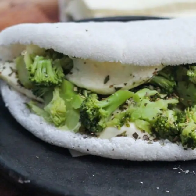 Massa de tapioca artesanal, Brócolis picadinho, mussarela e orégano.