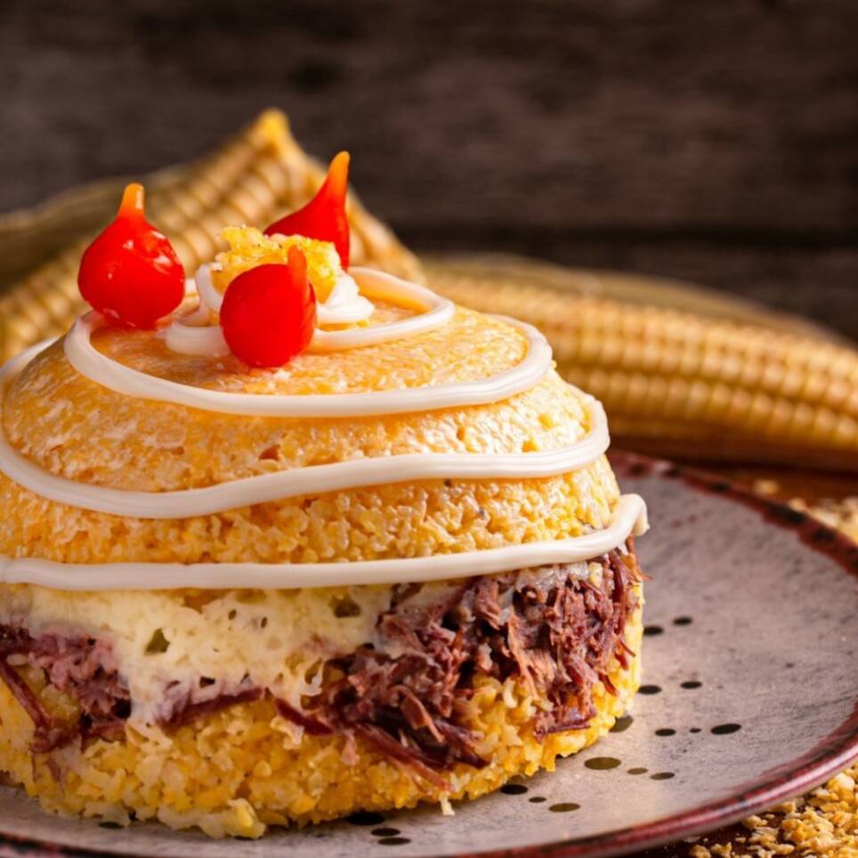 Cuscuz recheado com carne seca, mussarela, requeijão em cima vai mais um adicional de requeijão e para ficar ainda melhor acompanha um delicioso vinagrete.