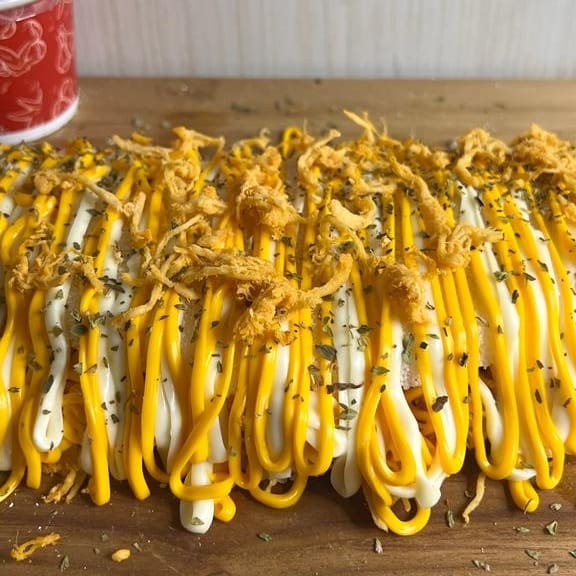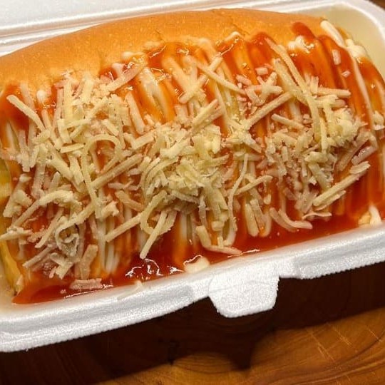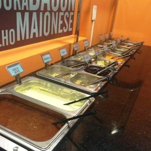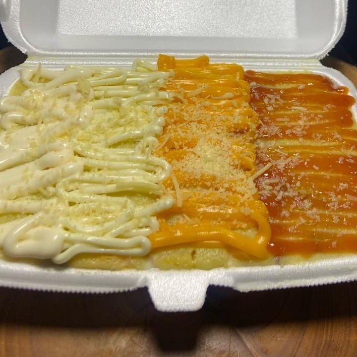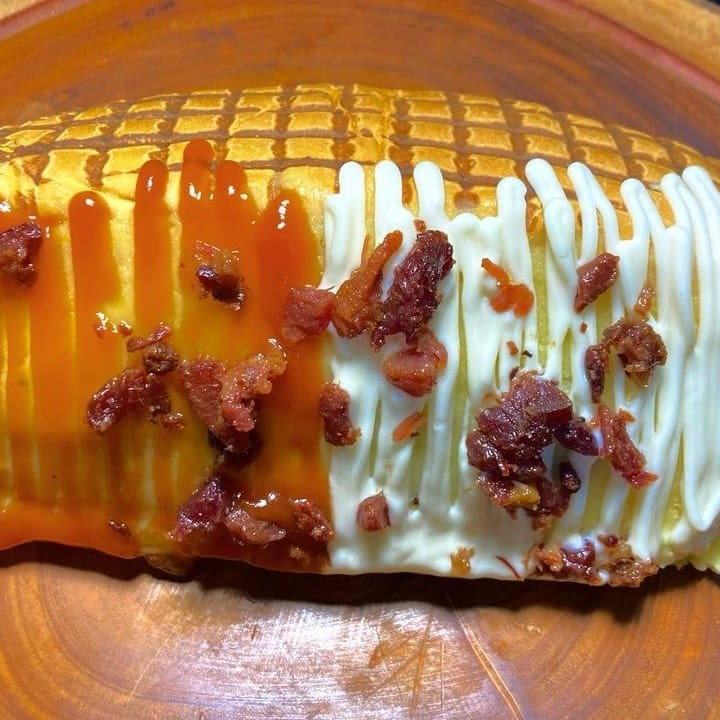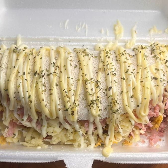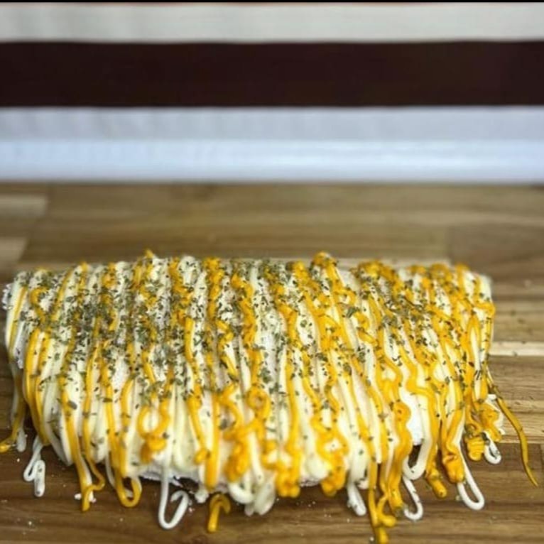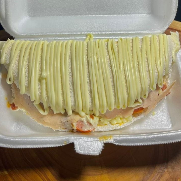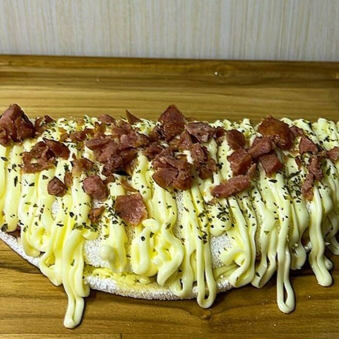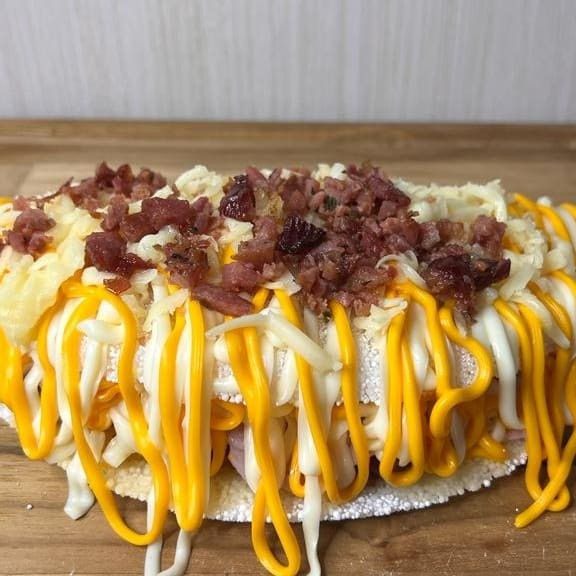 Massa Tapioca Recheada Com 2 Salsicha Sadia ,Molho de Tomate, 4 Queijos, Barbecue, Cream Cheese, Calabresa, Batata Palha, Pimenta, Mussarela Peito de Peru.