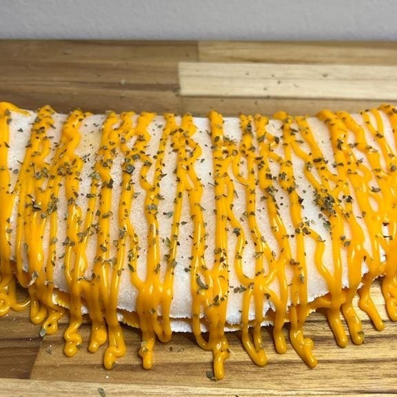Massa de Tapioca recheada Com Frango Desfiado , Cheddar e Orégano .