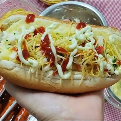 Pão de Hot Dog. De 20 Cm , 1 Salsichas (Sadia) , Purê Francês (100% Natural ), Frango Desfiado , Catupiry, Cheddar, Ketchup , Milho , Bacon , Maionese e Queijo ralado, Batata Palha separado para não muchar