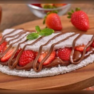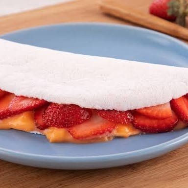 Massa de tapioca premium, recheado com doce de leito, Morango e coco ralado.