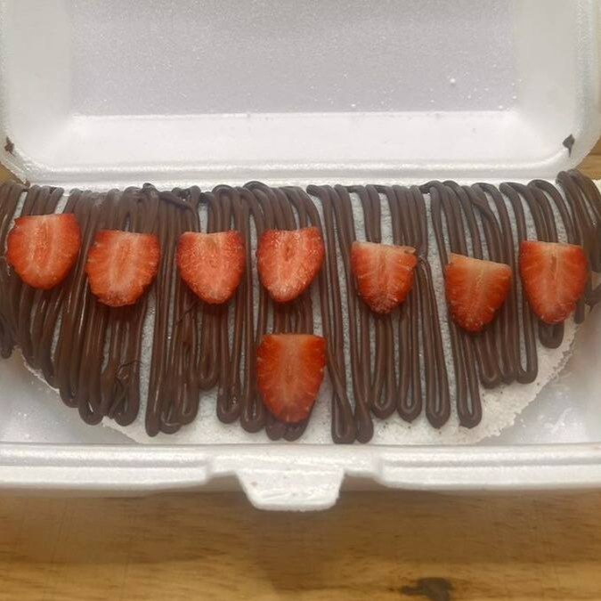 Massa de tapioca premium, recheada com doce de leite coco ralado, banana, canela, chocolate ao leite pra finalizar.