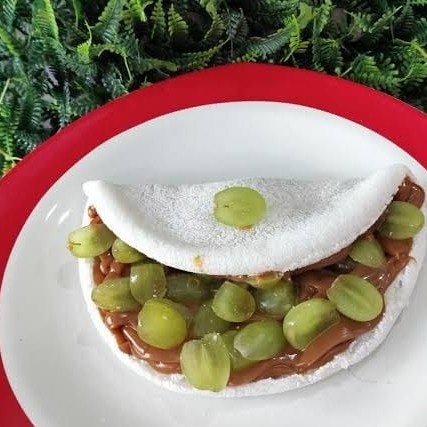 Massa de tapioca premium, recheada com uva verde sem semente, doce de leite, coco ralado, leite Ninho.