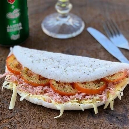 Massa De Tapioca Recheada Com Manteiga ,Cheddar, Catupiry, Milho , Bacon , Calabresa , Frango Desfiado , Orégano e Tomate .