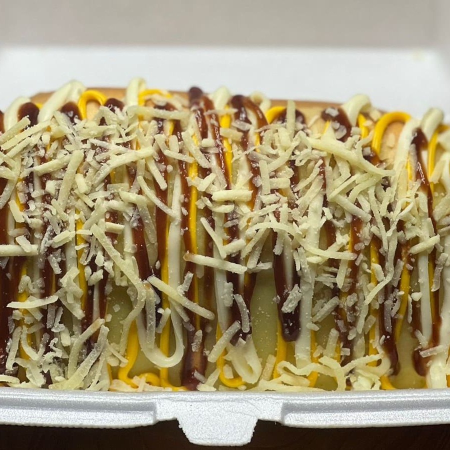 Purê francês 100% Original, 2 salsichas Sadia picadas, ketchup, mostarda, maionese, frango desfiado, calabresa, bacon, milho, Catupiry, mix de 4 queijos, queijo ralado, batata palha e Doritos crocante.