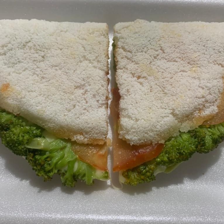 Brócolis temperado, queijo branco, tomate e orégano.