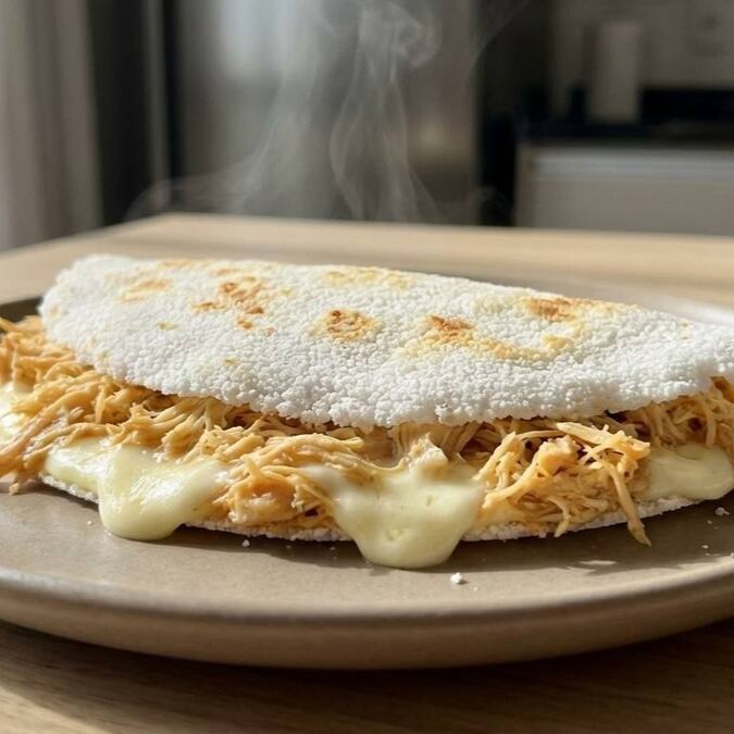 Frango desfiado e temperado, acompanhado de queijo derretido, uma combinação simples e deliciosa.