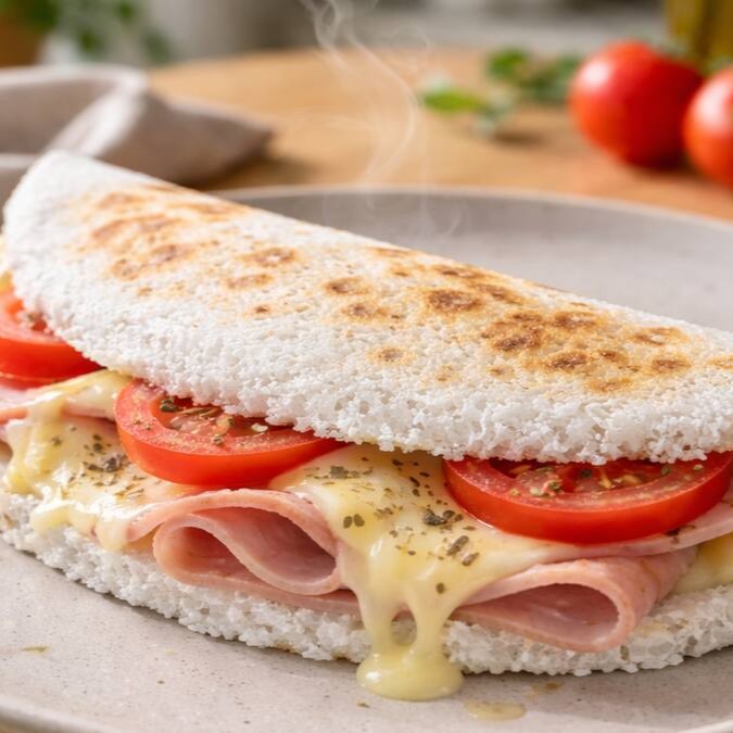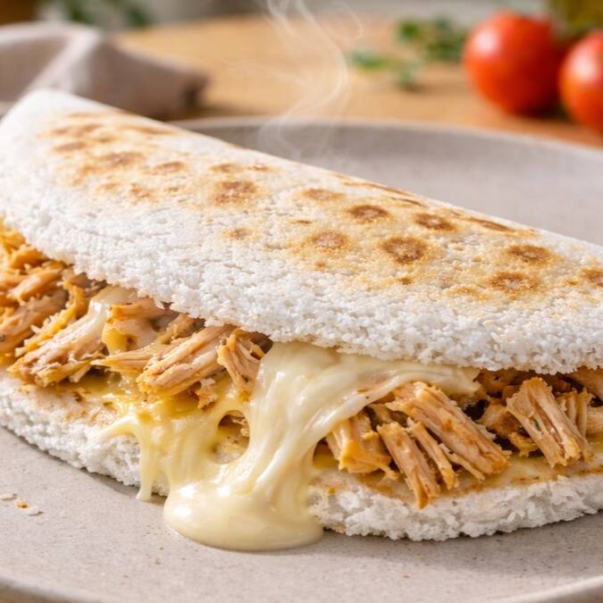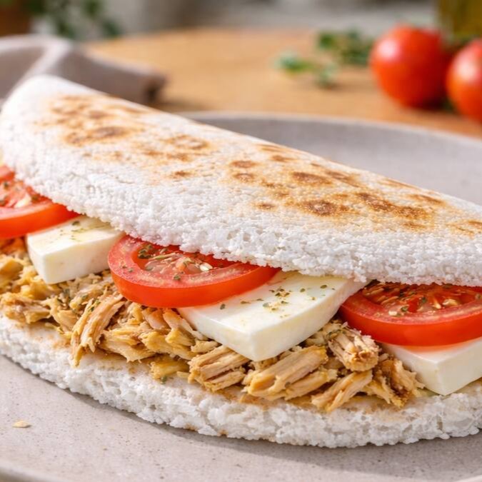 Uma opção leve e deliciosa com frango desfiado, queijo branco suave e fatias frescas de tomate.