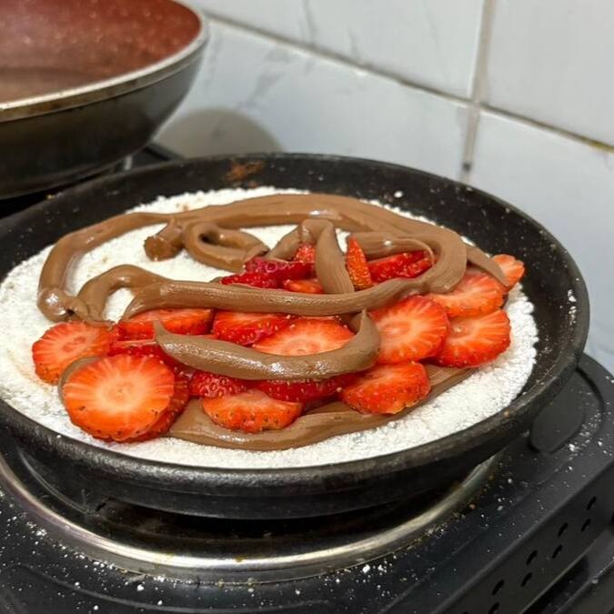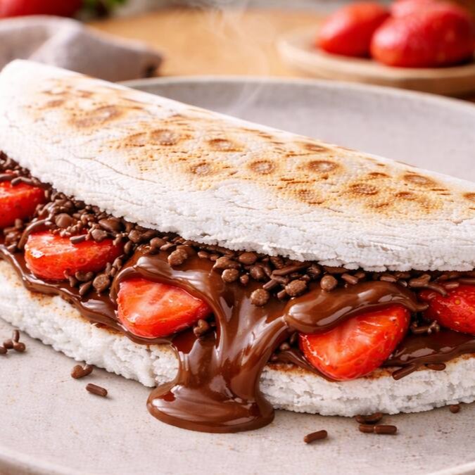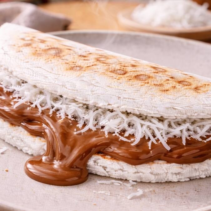 Uma tapioca recheada com chocolate ao leite derretido, e coco fresco perfeita para os chocólatras.