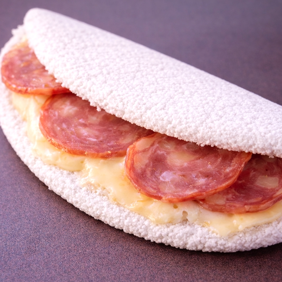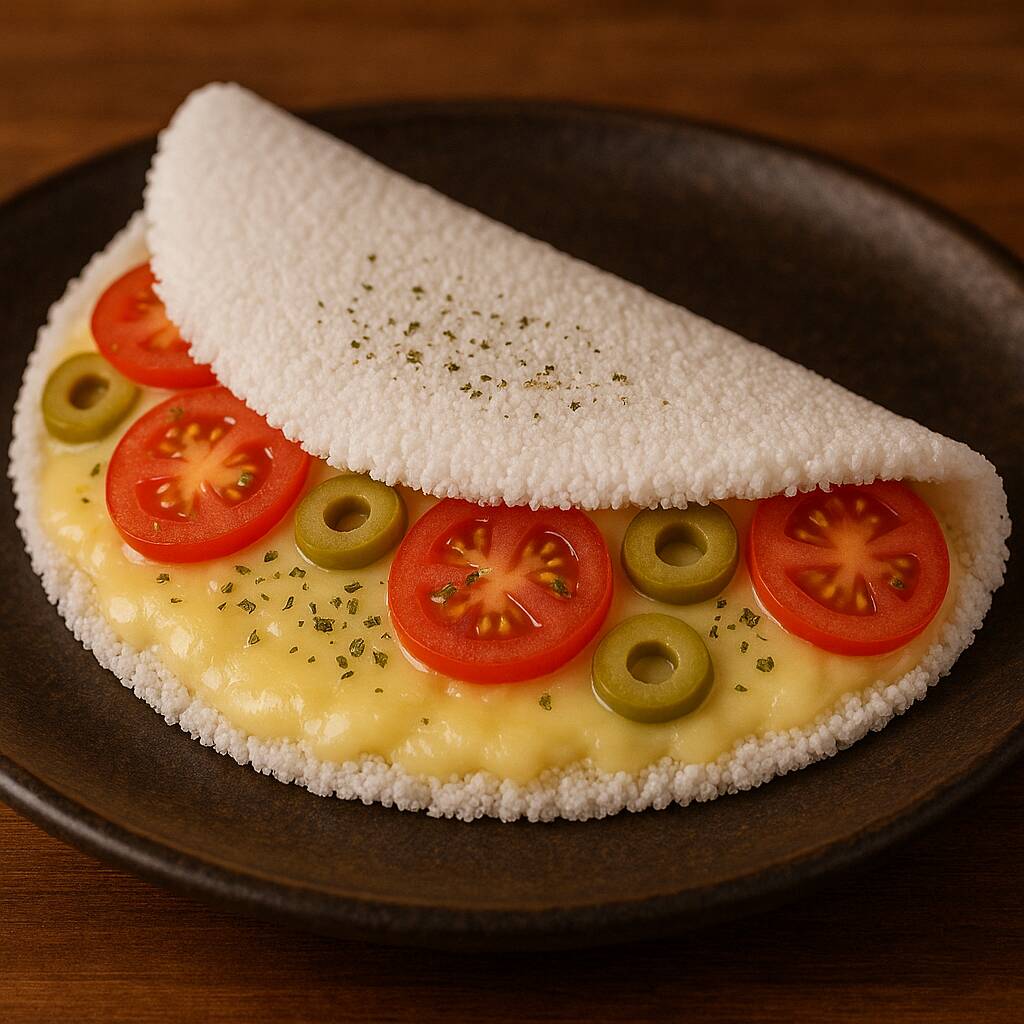 Massa de tapioca com Mussarela, Azeitona, Tomate, Oregano