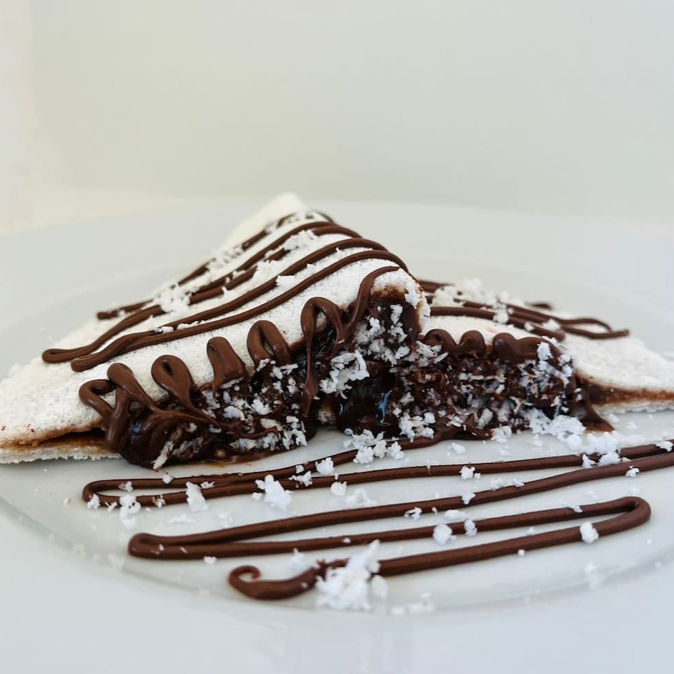 Tapioca surpresa o Gladiador Feita com a goma do Norte, original, branquinha e ligadinha, firme como muralha e leve como vento. Dentro dela, repousa o ovo frito na manteiga, de gema dourada como o sol em triunfo, unido ao creme de amendoim — cremoso, intenso, vigoroso. Uma combinação ousada, tão harmoniosa quanto um exército em marcha. Crocância, energia e sabor que erguem o espírito e sustentam a jornada.