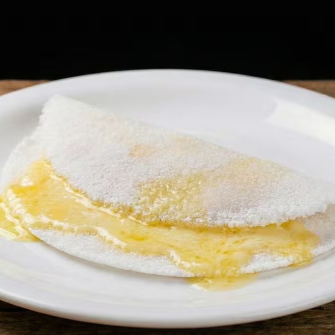 A essência da simplicidade com o máximo de sabor: nossa tapioca artesanal tradicional é preparada com todo o cuidado e finalizada com o brilho e o aroma irresistível da legítima manteiga de garrafa.