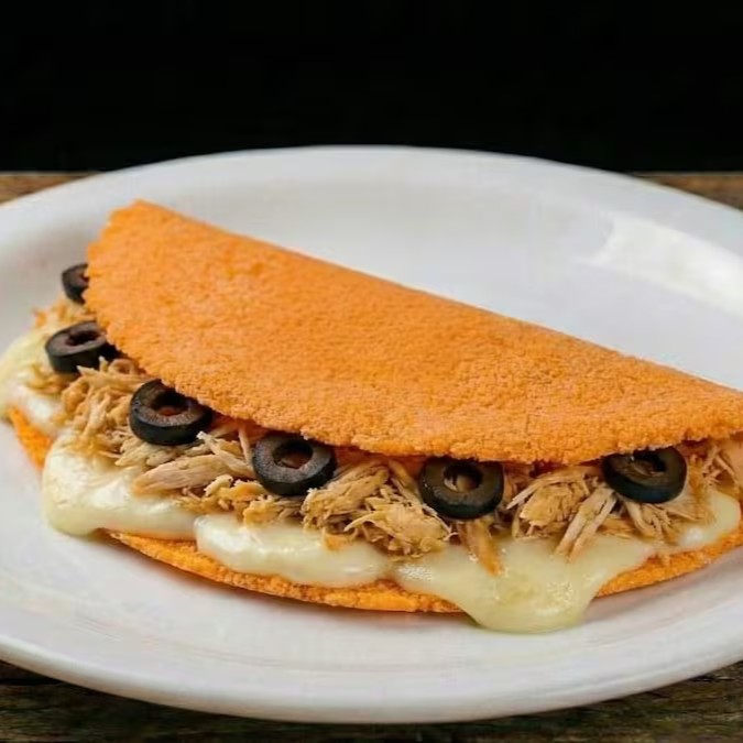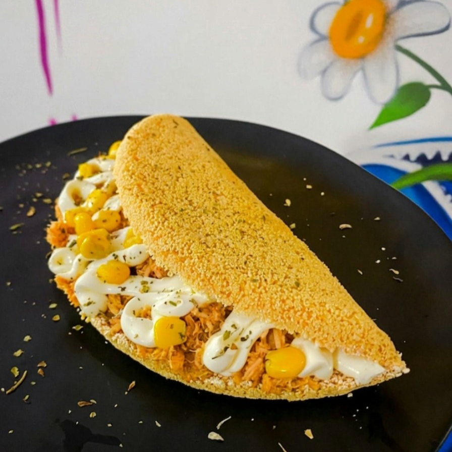 Experimente a perfeição em cada mordida: nossa tapioca artesanal de cenoura, com uma massa leve e vibrante, recheada com um frango desfiado temperado na medida, o toque cremoso do legítimo Catupiry e o frescor do milho.