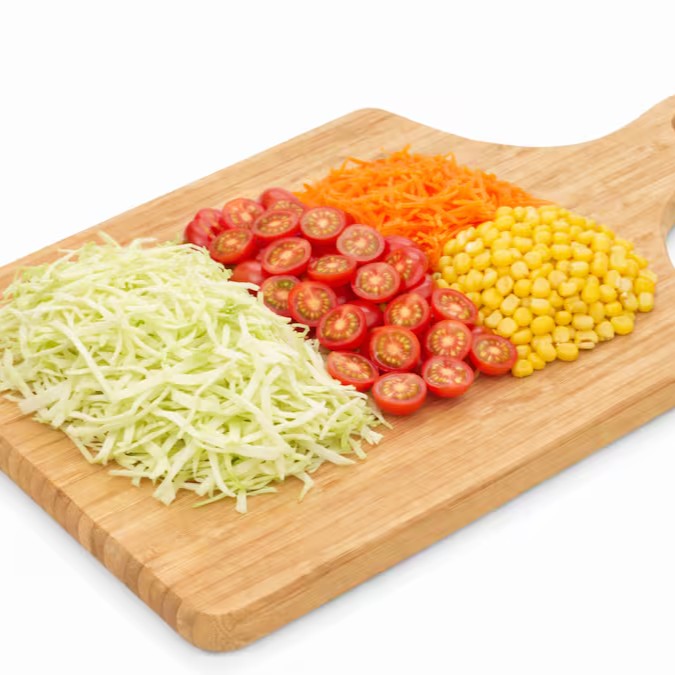 A sinfonia da crocância: o frescor do repolho em harmonia com a doçura do milho e da cenoura, finalizados com a explosão suculenta do tomate cereja.