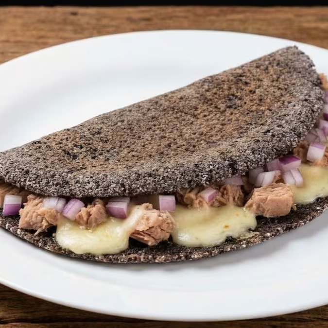 Surpreenda seu paladar com a nossa tapioca artesanal de azeitona preta, que traz uma massa exclusiva, marcante e cheia de cor. Por dentro, o sabor inconfundível do atum se funde à mussarela derretida e ao toque levemente adocicado da cebola roxa crocante.