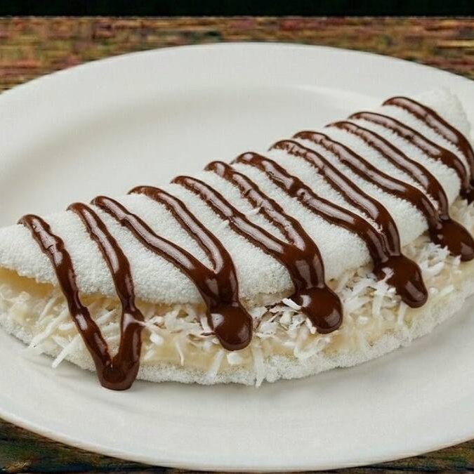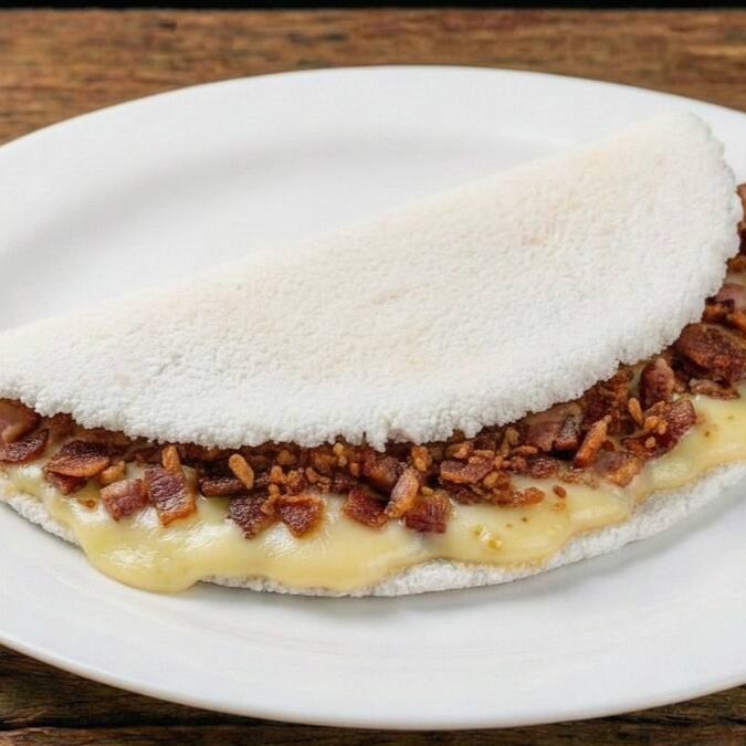 Prepare-se para uma explosão de texturas com nossa tapioca artesanal tradicional: a crocância irresistível do bacon e o toque dourado do alho torrado mergulhados na cremosidade generosa do legítimo Catupiry.