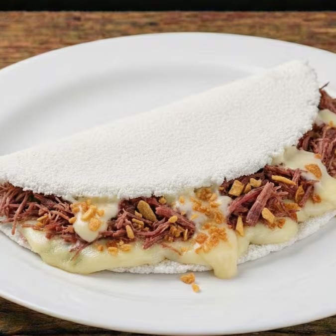 A tradição encontra a sofisticação na nossa tapioca artesanal tradicional: um recheio generoso de carne seca desfiada e suculenta, equilibrado com a cremosidade do cream cheese e a crocância irresistível do alho torrado.