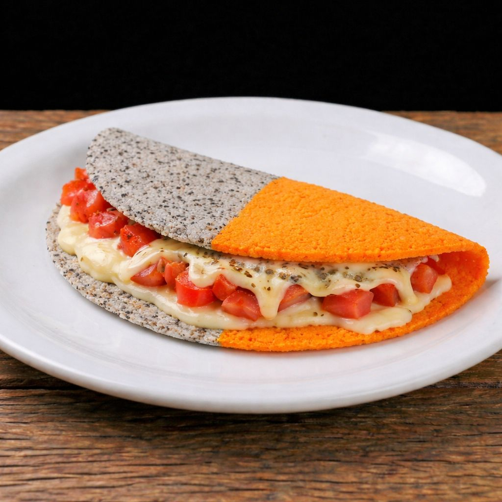 A clássica e amada tapioca feita com uma massa exclusiva de azeitona preta e cenoura, em sua versão mais irresistível: o sabor autêntico de pizza, com muita mussarela derretida, o frescor do tomate fatiado e o aroma inconfundível do orégano. Um preparo artesanal, leve e quentinho, feito à mão para transformar seu lanche em um momento especial!