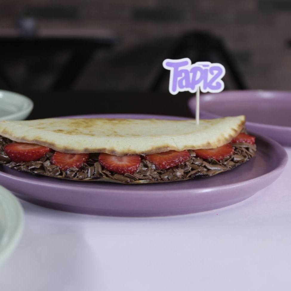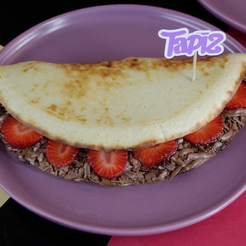 Massa Artesanal de Tapioca sem Conservantes e sem Glúten. O recheio é com Chocolate Premium Ralado e Morango (produtor próprio). O resultado é uma Tapioca Maravilhosa.