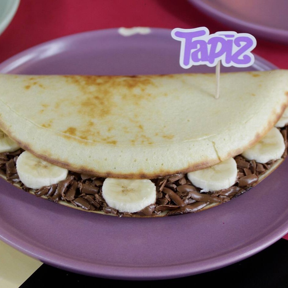 Massa Artesanal de Tapioca sem Conservantes e sem Glúten. O recheio é com Chocolate Ralado Premium com Banana Nanica Fresca.