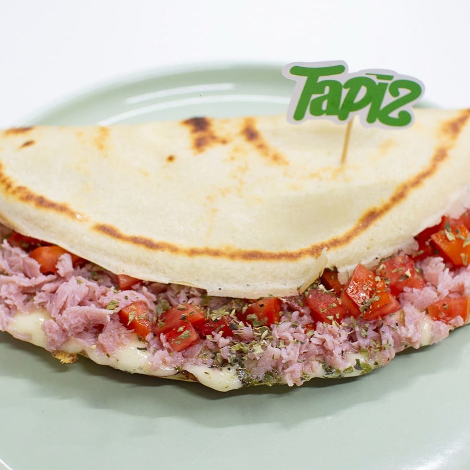 Massa Artesanal de Tapioca sem Conservantes e sem Glúten. Feita com Presunto e Mussarela Premium Ralado com Tomate picado e orégano.